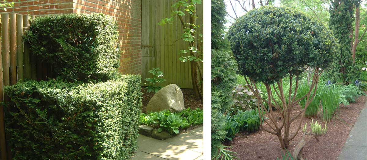 Eftersom buxbom inte trivs i zon 5, formklipp måbär, Ribes alpinum, hasselört som marktäckare. Tålig Rosa 'New Dawn' hittar man i Wij i Ockelbo. Enkla vanliga tåliga växter i spännande kombinationer.